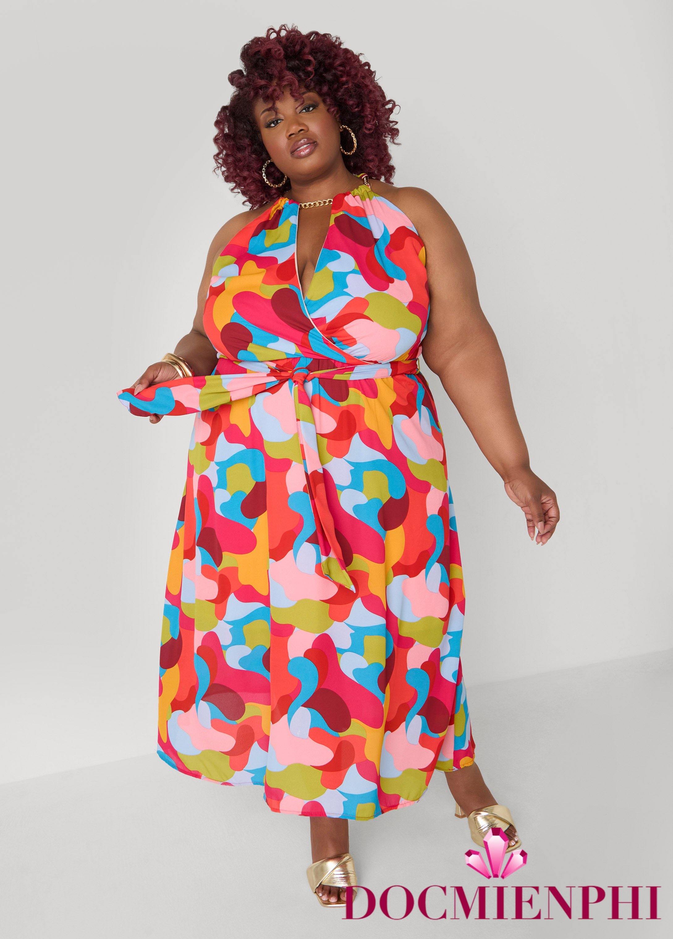 Shades of pink & green, cream & black all team up in a geo print that does everything right in the name of fashion. The faux wrap neck meets chain-link straps that takes the work out of matching accessories.