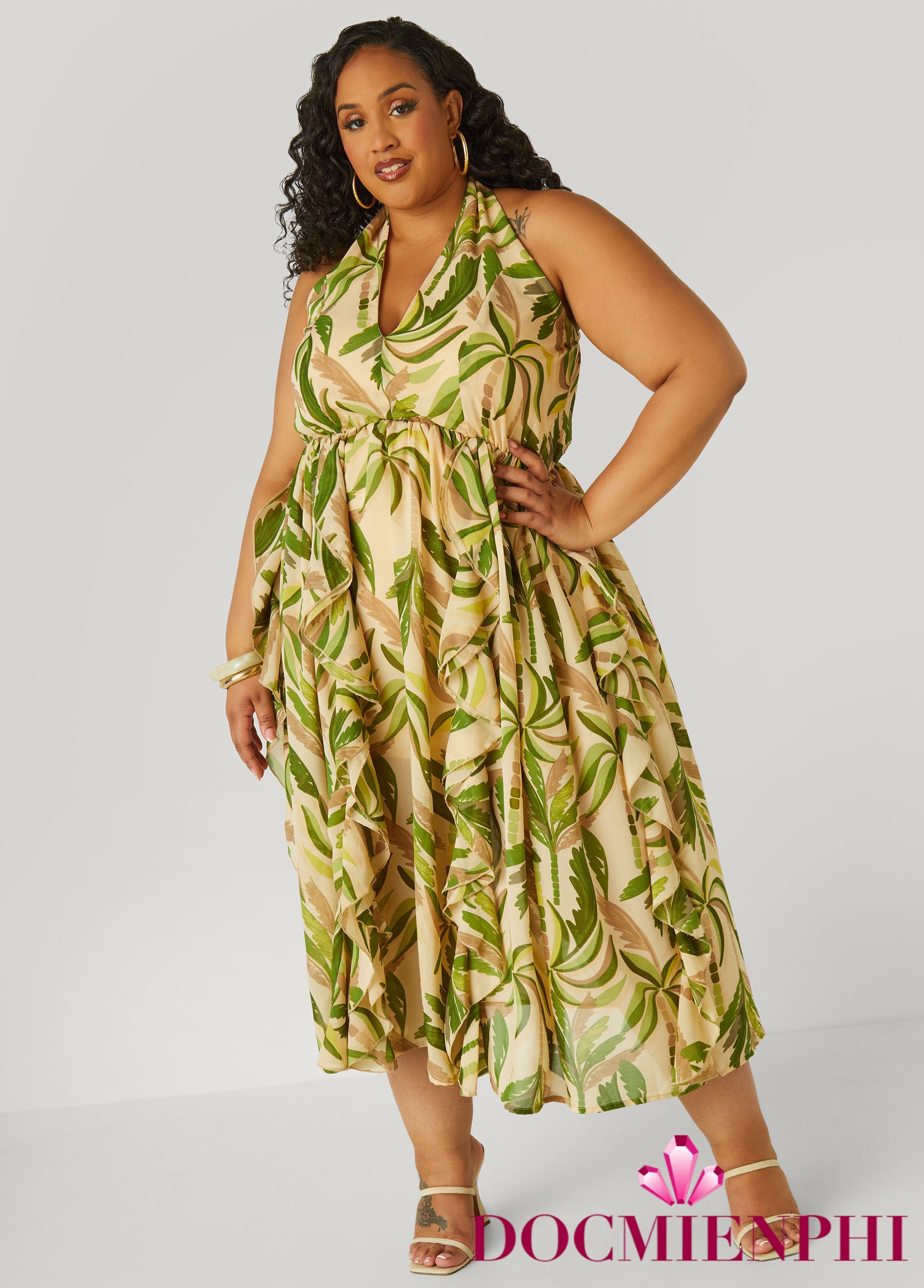 Tropic like it’s hot. This palm print crepe halter dress brings the sunshine with flirty ruffled trims, a deep V-neckline and a stretchy waistband that cinches just right. Your go-to for beach brunches and rooftop nights.