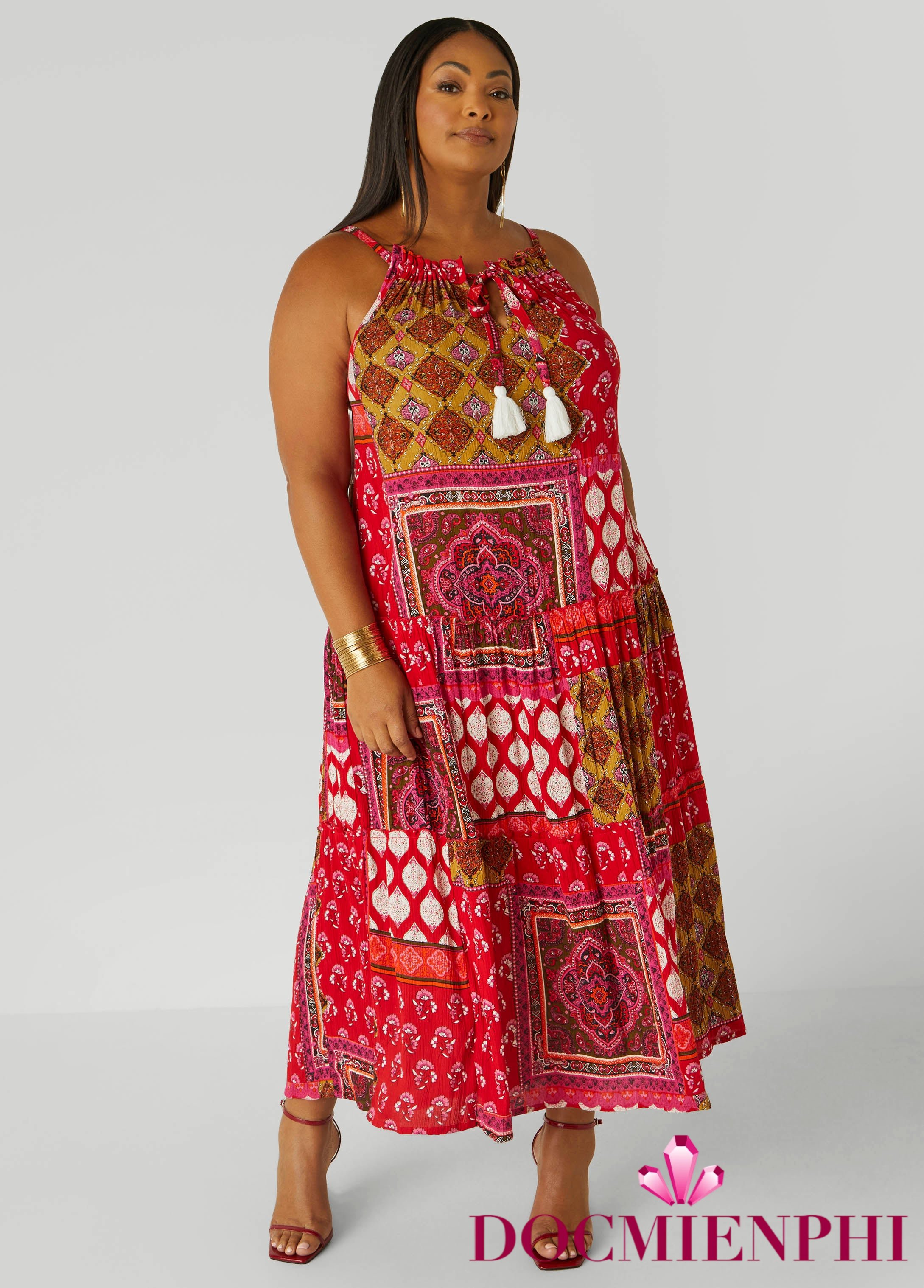 Soak up the sun in this scarf print maxi made from breezy textured fabric with ruffled trims and tassel ties at the keyhole front. A playful back cutout keeps it cool, perfect for warm days and weekend getaways.