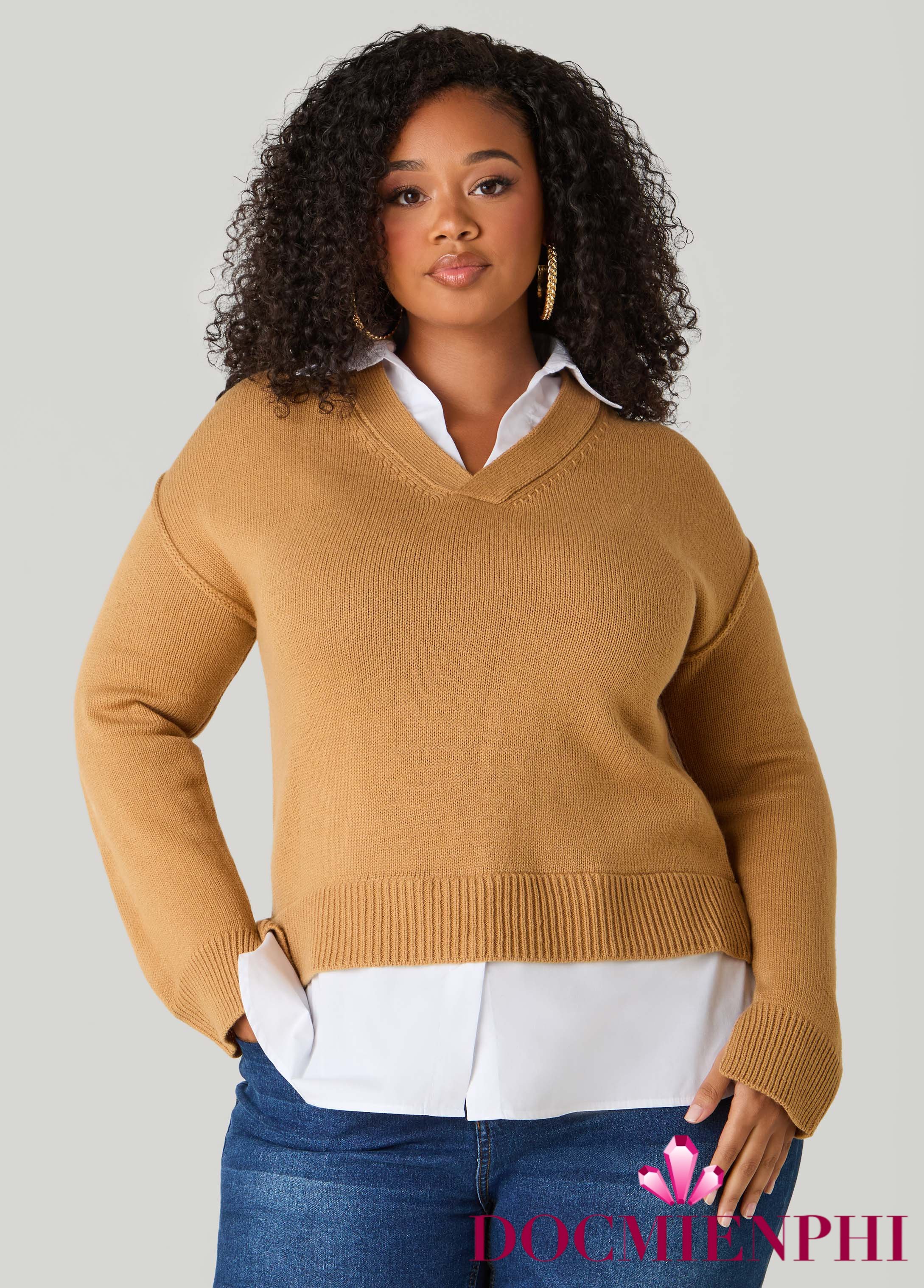 The look of layers without the worry of bulky, fall into #preppycore with our V-neck sweater completed with poplin panels and a split, dipped back hem.